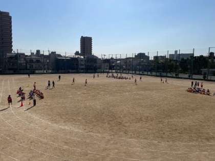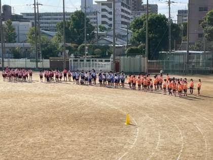 学年種目の全員リレーの練習をしました。1組が赤、2組が青、3組がオレンジです。