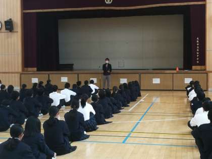 毎週木曜日の朝に、2年生の学年集会を行っています。今日の先生からのお話は、「職場体験学習に向けて」のものでした。明日、事前挨拶訪問に行き、来週の木曜日と金曜日に職場体験に行く予定をしています。