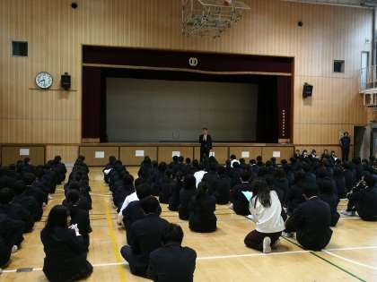 毎週月曜日の朝に全校集会を行っています。今日の校長先生からのお話は、タレントの「本田望結」さんの生き方に関するものでした。「うまくいかないことがあっても、『悔しい』という気持ちをバネにして取り組もう」というものでした。