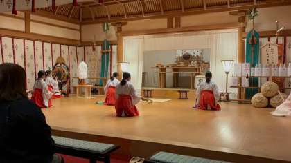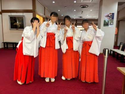2日目の住吉大社での職場体験学習では、「神楽」を踊りました。学校を出発する前も、一生懸命に自主練習をしていました。