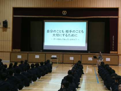 12月13日(水)の6限目に、デートDVについてのお話を養護教諭から聞きました。デートDVとは具体的にどのようなものなのか、どうすれば自分も相手も大事にできるのか等、考えました。