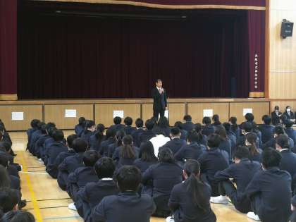 毎週月曜日の朝に全校集会を行っています。今日の校長先生からのお話は、「目標をもって努力し続けることの大切さ」についてのものでした。フルマラソンを完走した校長先生の体験談も聞くことができました。