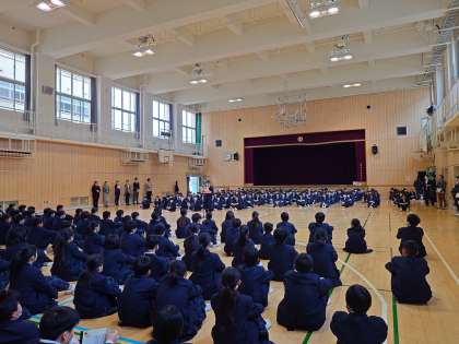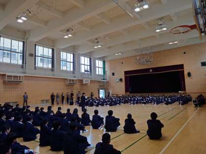 全校生徒325名で1学期をスタートしました。対面式で新入生と在校生が初めて顔を合わせ、代表生徒が互いにあいさつを交わしました。