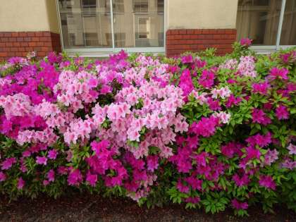 本校では、校内のあちらこちらで《ツツジ(躑躅・映山紅》が咲き始めています。日当たりのよい中庭ではも満開に近いほどきれいに花をつけています。