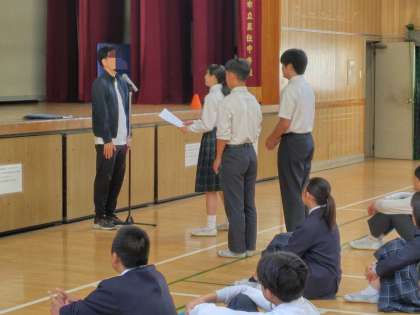 今日の学年集会では、修学旅行2日めの夜に行われたレクリエーションの表彰を行いました。