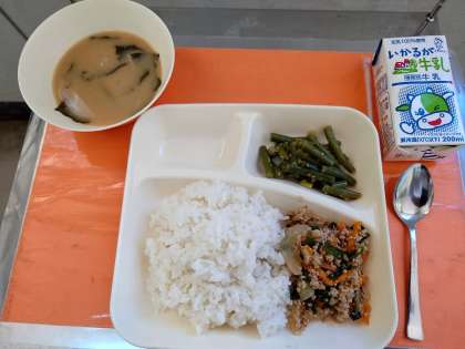今日の給食の献立は「豚ひき肉とニラのそぼろ丼 じゃがいものみそ汁、さんどまめのごまあえ、牛乳」でした。