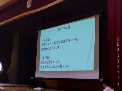 生徒会より先週の生徒議会で話し合った《先月の反省と今月の目標》について連絡がありました。
