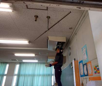 昼間の暑さがまだまだ厳しい中、空調の効きが悪くなっているクラスが出てきているため専門の業者の方に来てもらって《エアコン内部洗浄)》をしてもらっています。