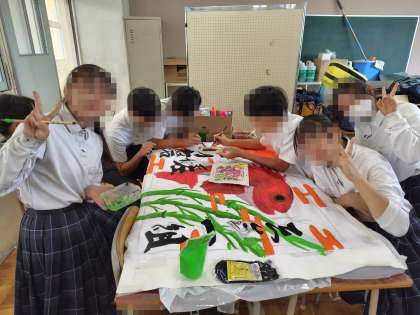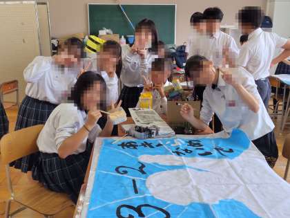 中間テストが終わり、体育大会に向けて学級旗づくりが再開しました。