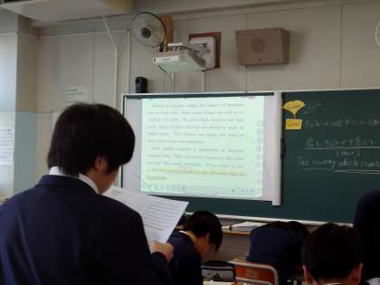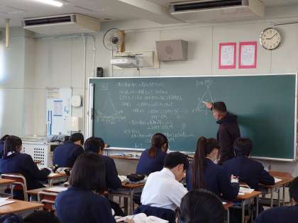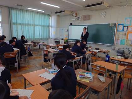 1年生理科(習熟度別授業)「力のはたらき」、2年生数学「三角形の合同条件の証明」、3年生英語「チョコレートの歴史(Fair Trade)」の授業です。毎時間の授業の積み重ねが何より大切です。