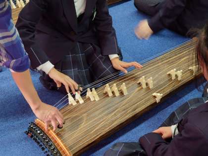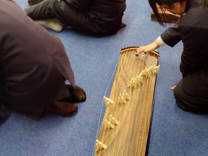 今日の実技では《箏(こと)》に取り組みました。ほとんどの人が弾くのはもちろん、実物を見るのも初めてだったようです。