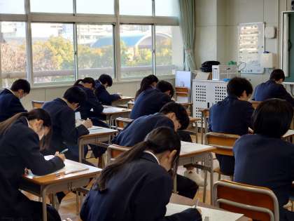 今朝は風が強く、体感温度が低く感じましたが、3年生は昨日に引き続き《学年末テストに取り組んでいます!》今日のテスト科目は1限:保体、2限:社会、3限:英語です。頑張れ32期生😲