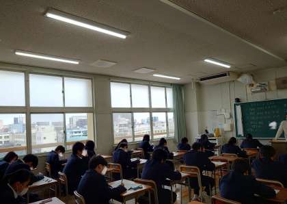 《1・2生学年末テスト最終日》を迎えました。1年生は保体・数学・国語、2年生は音楽・数学・国語のテストに取り組んでいます。