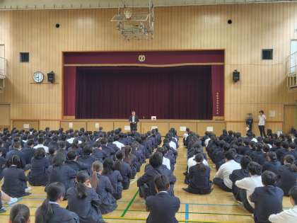 校長先生から「いじめについて考える日」「いのちについて考える日」の講話があり、生徒会執行部からは先日の生徒議会で決まった5月の月間目標『授業中は私語を慎み、集中できる環境を作ろう』『地域の人に迷惑をかけないように気をつけよう、修学旅行や遠足など校外行事で真住中学校生として恥ずかしくない行動をしよう』に決まったことの報告とお昼の放送『リクエストボックス』を各学年のフロアーに設置するので、リクエストを待っていますという連絡でした。