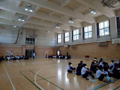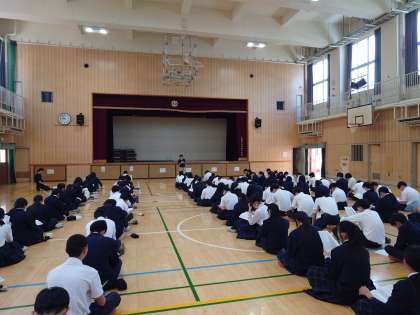 3年生が修学旅行の2日めに行う《選択別体験「ドルフィントレーナー体験」「いちご狩り・ジャム作り体験」「マリンアクティビティ」》現地での活動についての説明を受けました。
