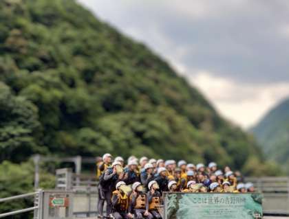 ラフティングのスタート地点に向かう前にクラスごとに記念撮影です。
