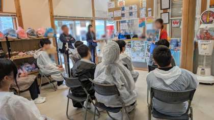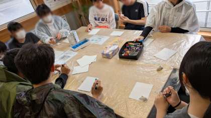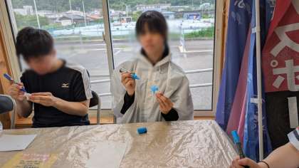 ドルフィンセンターでイルカの生態について説明を聞き、陶器のイルカに絵付けをしています。