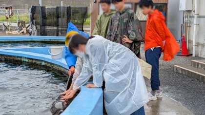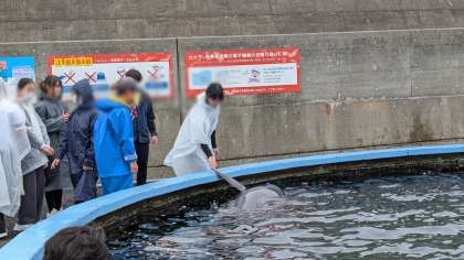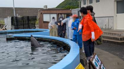 『ドルフィントレーナー体験』でイルカと触れ合っています。