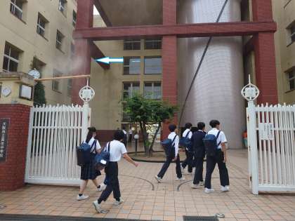 先週の梅雨明け発表以来、朝からすでに気温が上昇する毎日が続く中、今年も《「涼を感じる」ミスト》を正門に設置しています。