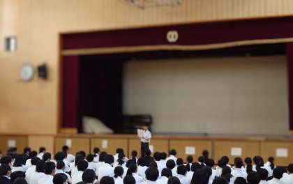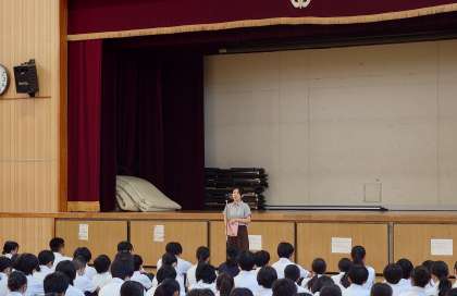 今日は校長先生の話に続いて、養護教諭の先生から「危険な暑さ」となっている毎日を安全に生活するための《熱中症防止対策》について、お話がありました。熱が体内にたまらないように服装を調節すること。水分が体内に吸収されるには30分程度かかることから、こまめな水分補給と運動する前に水分を摂ることが大切ですという内容でした。
