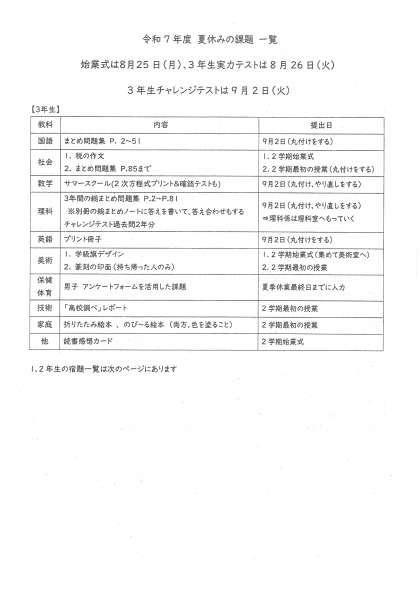 早めに終わらせて、夏休みをのんびり過ごしましょう。提出期限を必ず守ること。とくに3年生は2学期始業式すぐに実力テスト、大阪府中学生チャレンジテストも待っています。宿題プラス自分の学習にも取組みましょう。