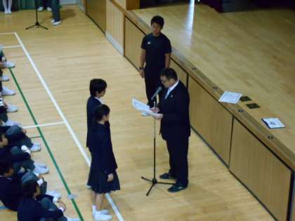 ゴールデンウィーク明け、あいにくの天候で始まりました。連休中はとても良い天気が続く中、各部活動も活発に活動できたことだと思います。全校集会では新しい学級役員の認証式と春の各大会の賞状の伝達が行われました。