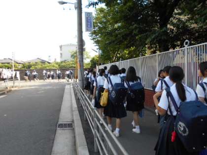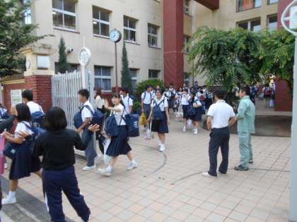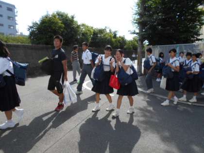元気よく学校を出発しました。この後、バスで大阪を離れます。