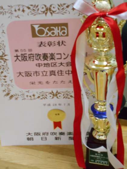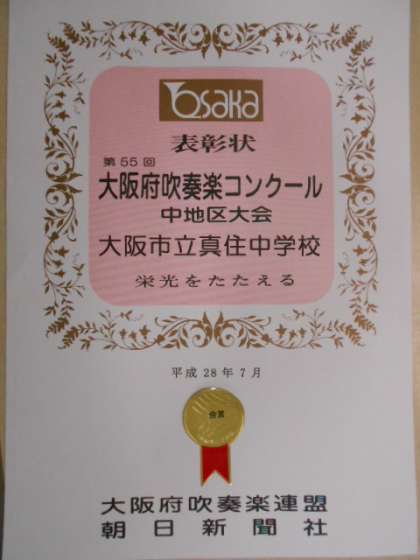 7月26日に、八尾プリズムホールで行われた、第55回大阪府吹奏楽コンクール 中地区大会で、本校吹奏楽部が金賞を受賞し、府大会進出を決めています。おめでとうございます。さらなる努力を期待しています。