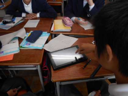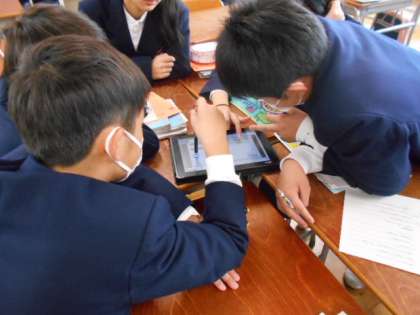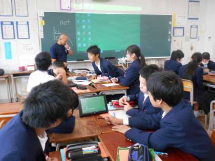 1年生の英語の授業の一コマです。班ごとにタブレット端末を配布し、ICTを活用した、協働学習を行っています。生徒は、楽しそうに問題に取り組んでいました。
