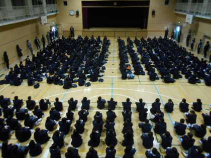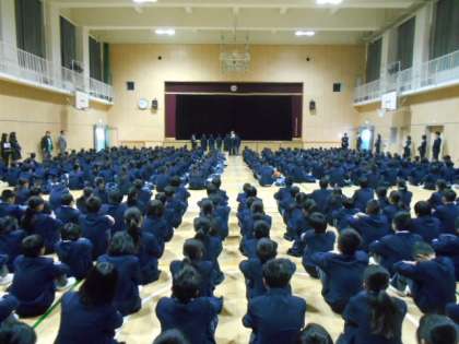 平成29年度、全校生徒458名がはじめて体育館にあつまりました。みんな緊張した雰囲気で始業式を迎えています。