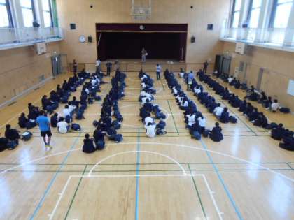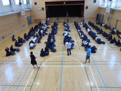 明日からの修学旅行に向けて、体育館で前日指導がありました。天気と忘れ物がないか心配です