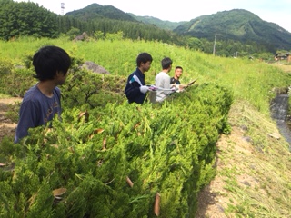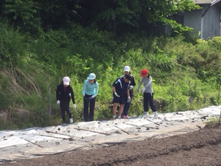 農作業体験です。大豆の苗植えと、植木の手入れです。「おいしい大豆になりますように♪」と、心を込めて植えました。植木の手入れは見た目が大事!芸術的に仕上げます!