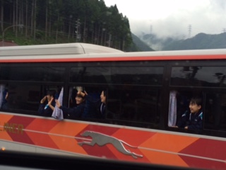 退村式も終わり、今からラフティング会場に移動です。みんな元気に出発です。