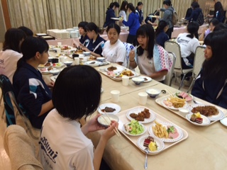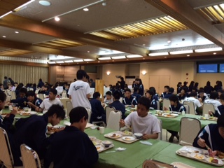 ラフティングも無事におわりました。今日の宿舎は「鷲ヶ岳レインボーホテル」です。お風呂も入り、楽しい夕食タイムです。