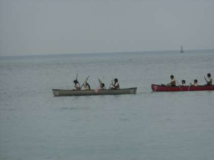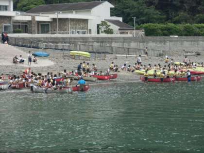 カヌー&カヤックで楽しむみんなの後方に潜水艇が顔を出しました。