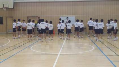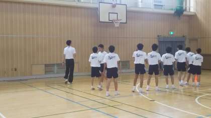 体操・レイアップシュート練習などのウォーミングアップを終え、バスケットボールの試合形式の授業でした。