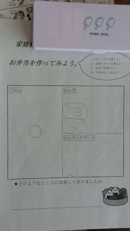 家庭科は「『五大栄養素』とお弁当の絵の作成」でした。