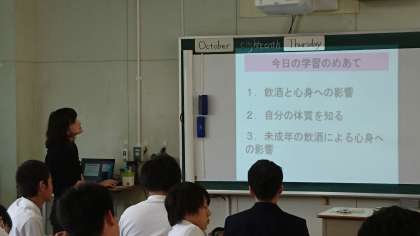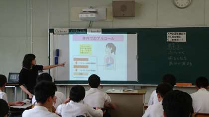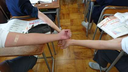 授業の内容は「飲酒の害と健康」でした。授業の中で自分の体がアルコールに弱いのかどうかを調べる、「パッチテスト」も行われました。