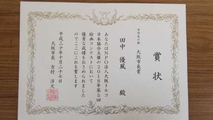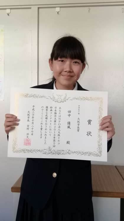 本校、1年生の田中優風さんが、NPO法人大阪トルコ日本協会主催の第5回絵画コンテストにおいて「大阪市長賞」を受賞いたしました。