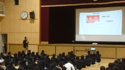 今日、16日の5時間目、1年生を対象に「歯と口の健康教室」がひらかれました。