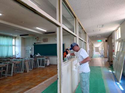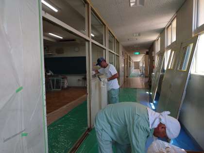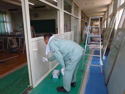 昨年の夏休みに引き続き、本校と校区小学校の管理作業員のみなさんたちの《合同作業》で北館3階2年生フロアー廊下の壁面塗装にしてもらっています。酷暑の中での作業、ありがとうございます。