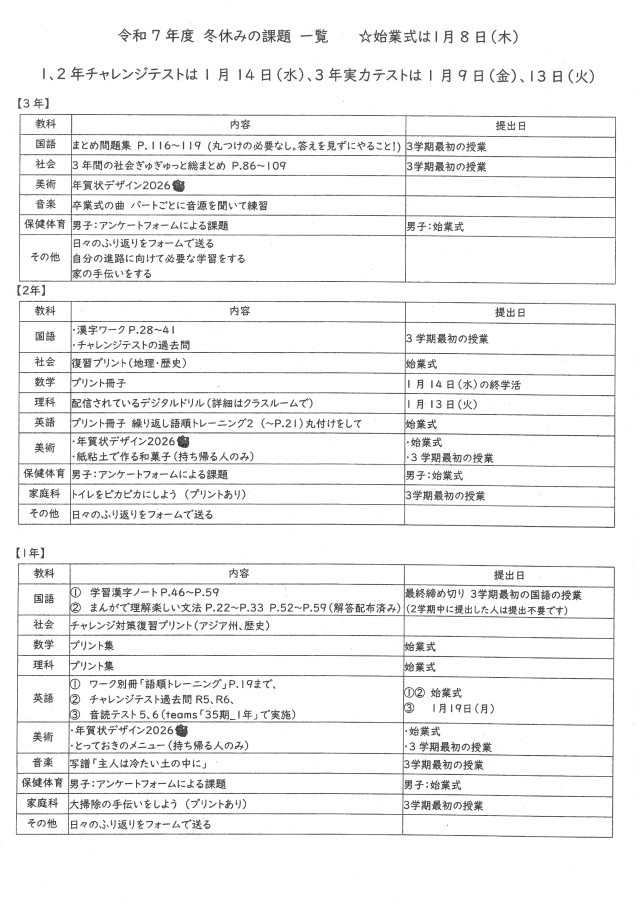 今年度は12月23日(火)が2学期終業式です。給食・大清掃のあと終業式を行います。