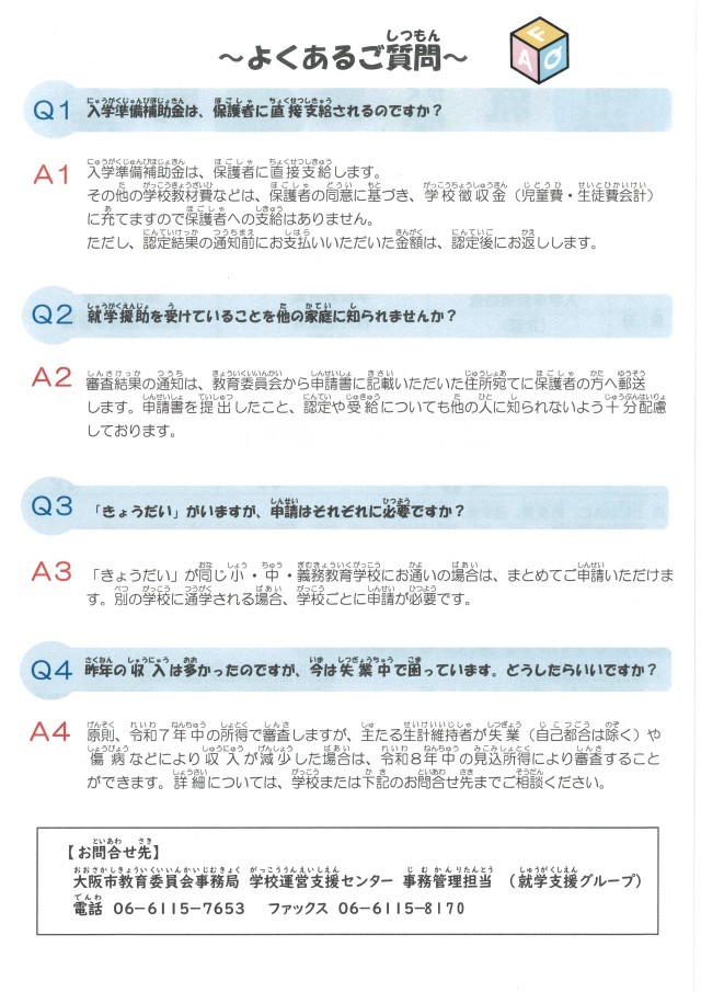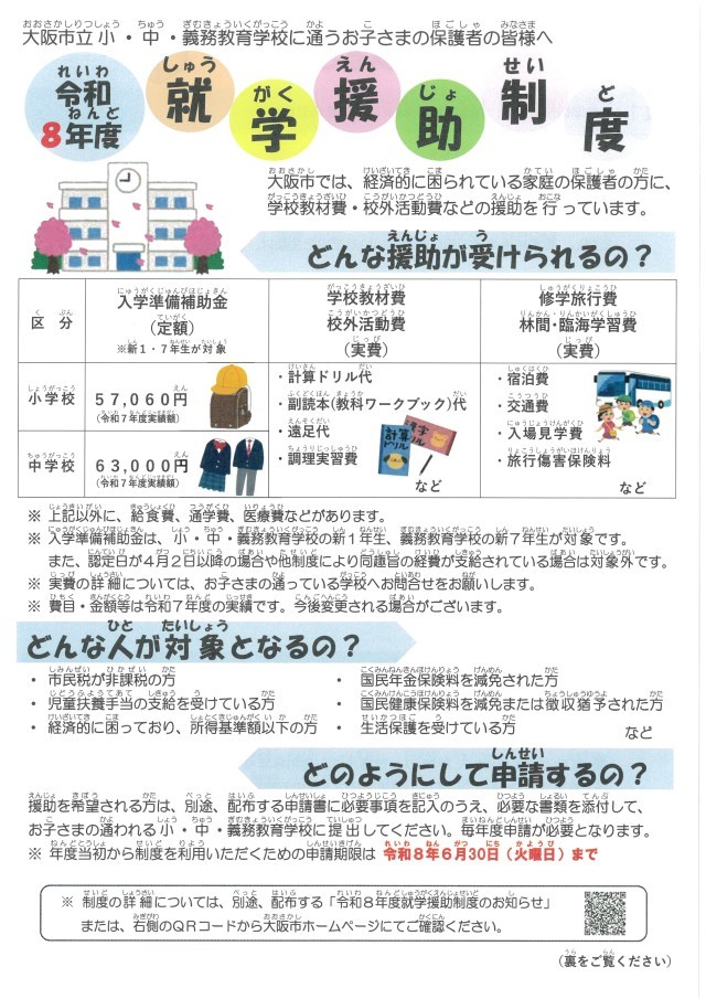 こちらから⇒令和8年度就学援助制度のお知らせ