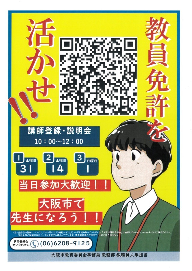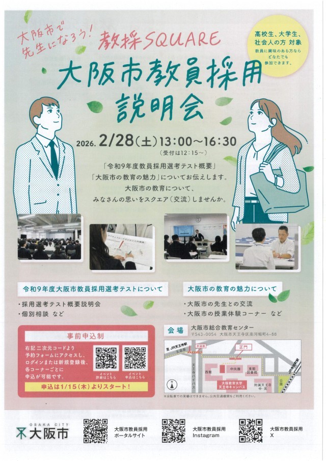 くわしくはこちらから⇒「教採SQUARE(大阪市教員採用説明会)」チラシ「講師登録・説明会」チラシ