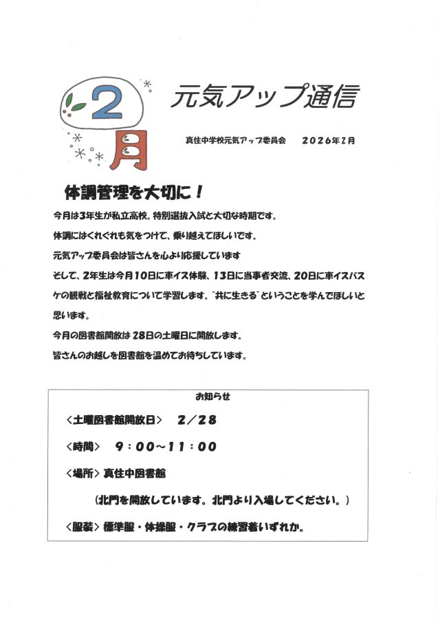 明日、28日(土)は学校元気アップ『土曜図書館開放』です。