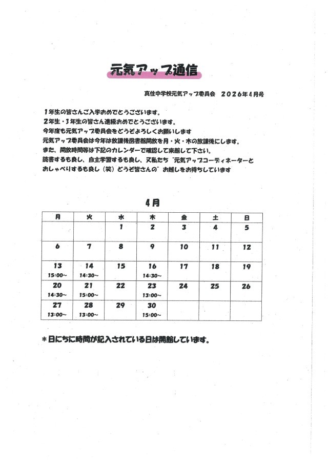今年度の『元気アップ図書館開放』は月・水・木の放課後に行います。