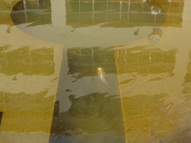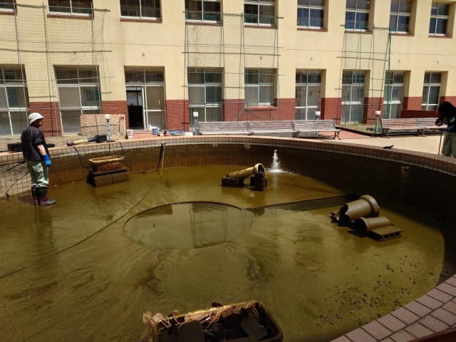 今日は朝から晴れ空に恵まれ、管理作業員さんが中庭の池の水を抜き、池の底や壁面のコケを