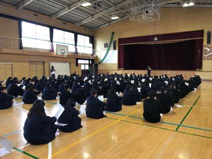 本日5限、3年生は18日(木)に実施される、全国学力・学習状況調査の説明と、今年度実施される、英語話すこと調査の受験会場(パソコン教室)への移動のをスムーズに行うための準備を行いました。