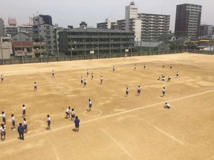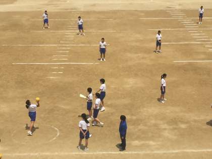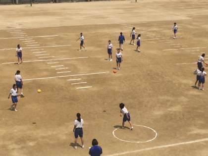 運動能力テストのハンドボール投げ(投力)を測定しています。