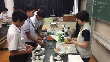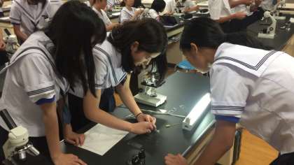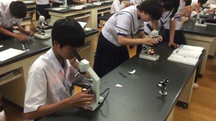 植物と動物の細胞のつくりを、タマネギの葉と人のほほの内側の細胞をとって顕微鏡で調べました。